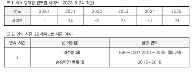 정해영은 올 시즌 24일까지 34경기에서 2승 3패 19세이브 평균자책점 3.38을 기록 중이다. 앞으로 세이브 1개만 추가하면 역대 3번째 5시즌 연속 20세이브 고지를 밟게 된다.