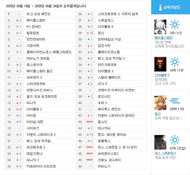 이번 주에는 서브컬처 게임 2종의 희비가 크게 엇갈렸다. 지난 18일에 신규 캐릭터 2종을 포함한 5.7 버전을 적용한 원신이 지난주보다 16계단 오른 29위를 달성한 반면, 6월 12일에 2.4 버전을 선보인 ‘명조: 워더링 웨이브’는 1주 만에 15단계 하락하며 45위에 그쳤다. 하위권에는 2주년 기념 여름 이벤트를 앞세운 ‘브라운더스트2’가 48위로 진입하기도 했다. 주요 이슈에 따라 순위 변동폭이 큰 서브컬처 게임의 특징이 잘 드러난 주간이었다.