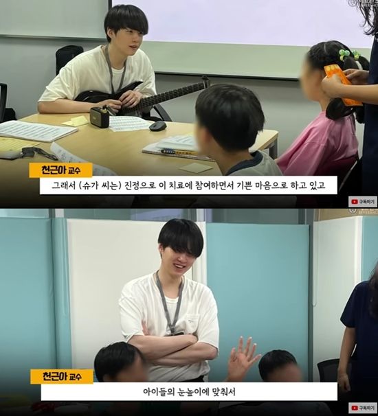 지난해 11월 천 교수를 찾아와 음악 재능 기부에 대한 의사를 밝혔다는 슈가. 천 교수는 "'정말 단순한 기부자가 아니구나'라는 걸 느꼈다. 프로그램 참여 내내 한 번도 지각 안 하고 저보다 더 일찍 와서 기타 연습하고 있더라. 아이들의 눈높이에 맞추려고 굉장히 애를 많이 썼고 슈가 씨의 행복한 표정을 잊을 수가 없다"고 이야기했다.