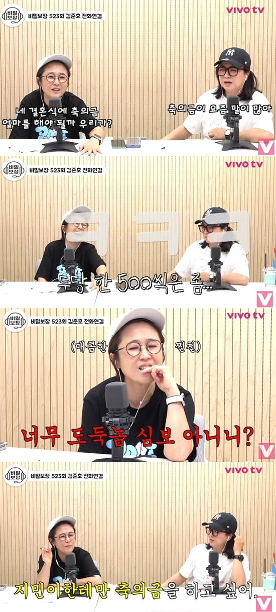 그러자 송은이는 "(김)지민이한테는 당연히 할 것"이라면서도 "네 첫 번째 결혼식 때 다 갔는데 500씩이나 받겠다는 건 도둑놈 심보 아니냐"고 발끈했다.