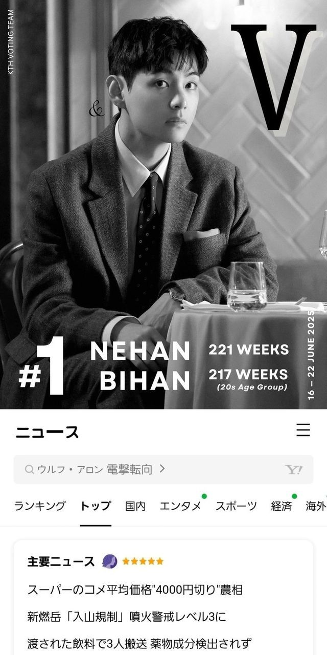 뷔는 6월 16일부터 22일까지 일본 인기 아이돌 랭킹 사이트 ‘네한’(NEHAN)에서 221주 연속 1위를 차지했다. 주 단위로 환산하면 무려 4년 넘게 정상의 자리를 지킨 셈이다. 같은 기간 한국 배우 인기 랭킹 사이트 ‘비한’(BIHAN)에서는 ‘20대 한국 배우’ 부문 217주 연속 1위를 달성했다. 배우도, 아이돌도 뷔가 1위다.