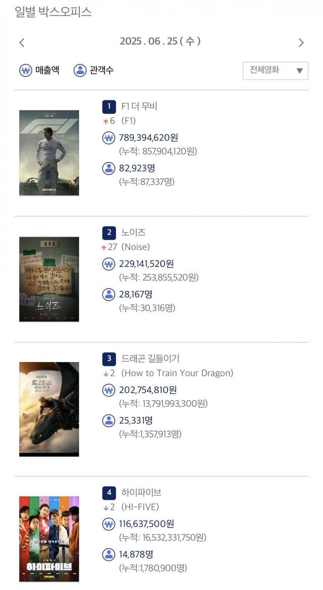 뿐 아니라 ‘노이즈’는 동시기 개봉작인 ‘F1 더 무비’에 비해 약 5분의 1 정도의 열등한 상영횟수에도 불구하고 좌석 판매율에서는 16.4%를 기록, ‘F1 더 무비’의 좌석 판매율 9.8%를 제치며 놀라울 정도로 높은 좌석 판매율을 기록했다.