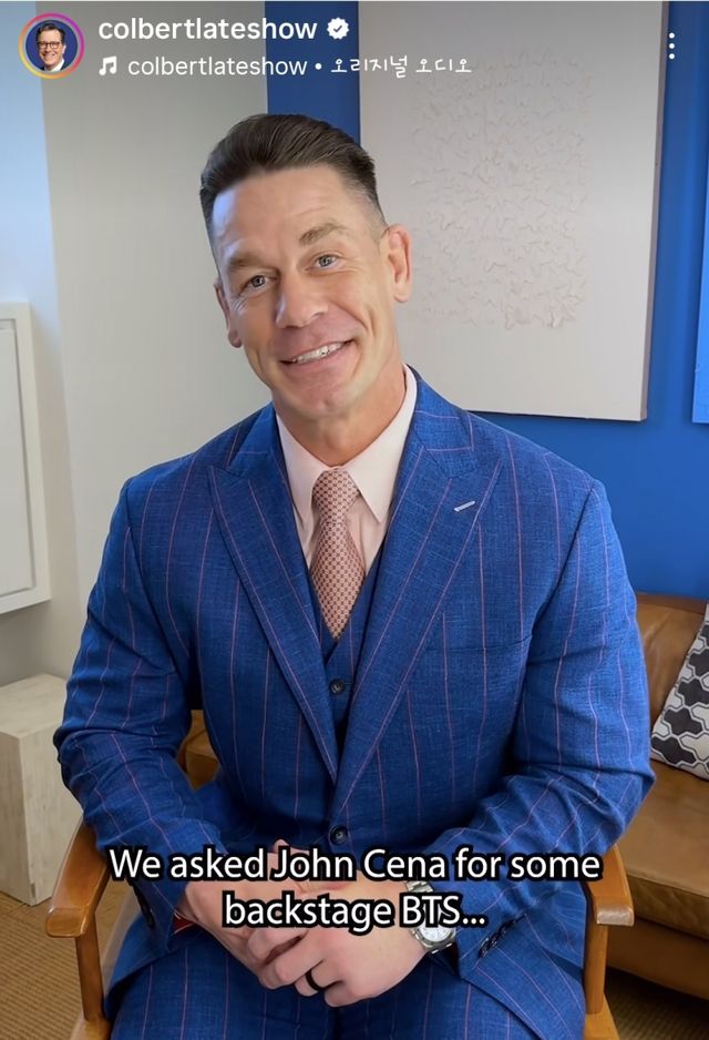 인기 TV 진행자인 스티븐 콜버트가 진행하는 미국의 인기 쇼 '더 레이트 쇼'는 지난 25일(현지시간) 출연한 존 시나를 소개하는 영상을 올렸다. 여기서 존 시나는 방탄소년탄(BTS)의 '진격의 방탄(The rise of BTS)'의 노래에 맞춰 팬들에게 인사했다. '진격의 방탄'은 2013년 나온 BTS의 초창기 곡으로, BTS가 세계적 인기를 끈 뒤 해외에서 이 노래에 맞춰 춤을 추는 챌린지가 한때 유행하기도 했다.