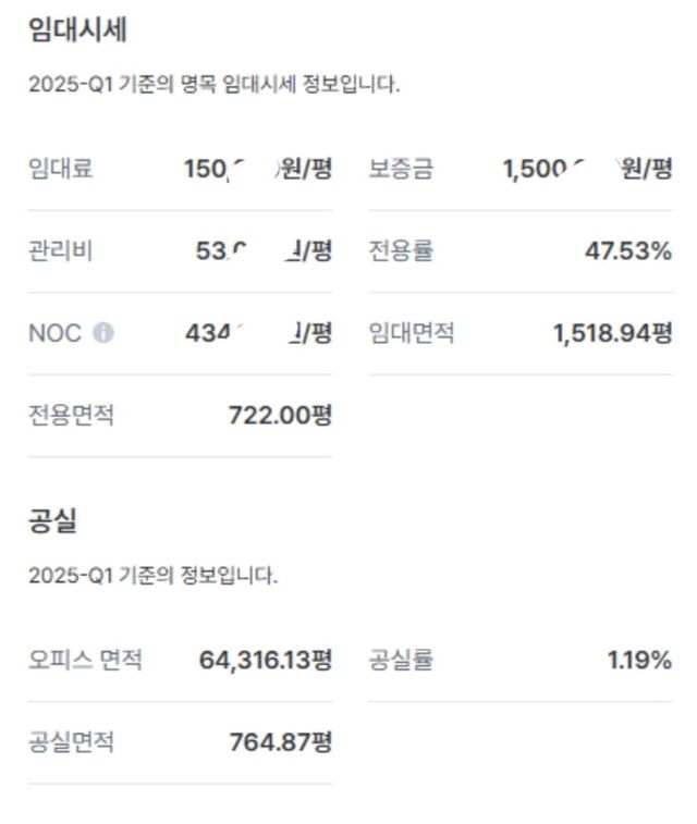 류강민: 빌딩을 사는 쪽이든 파는 쪽이든, 건물 가치가 대략적으로 얼마 정도인지 파악해야 하잖아요. 일단 사람들이 잘 아는 건물 ‘강남파이낸스센터(GFC)’를 예로 들어볼게요. 클릭하면 아까 말한 정보가 쭈욱 뜹니다. 가장 핵심인 ‘임대료’와 ‘공실률’부터 보죠.