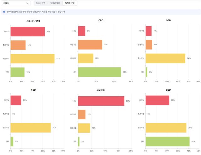 류강민: 기간도 설정할 수 있고, 그냥 어지간한 기능은 다 지원합니다. 더 깊게 들어가면 임차인들이 어느 권역에서 어느 권역으로 가는지, 이런 것들도 제공합니다. 예로 강남에서 광화문으로 얼마나 넘어가고 있는지, 또는 각 권역별로 대기업, 중소기업 비중이 어떻게 되는지 등등도 알 수 있습니다.