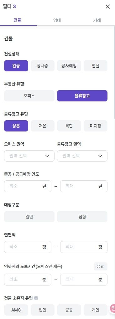 류강민: 자산운용사들은 대형 빌딩 외에 ‘물류창고’도 주요 자산으로 취급합니다. 대형 빌딩이 10이면 물류창고가 5~6 정도니까 결코 적은 비중은 아니에요. 물류창고만 보고 싶으면, 우측 상단 ‘필터’ 탭에서 ‘물류창고’를 클릭하면 됩니다. 권역은 오피스와 달리, 주로 수도권 어디 위치하는지로 필터링하면 되고요. 기타 다양한 옵션도 오피스처럼 하나하나 지정할 수 있죠.