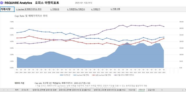 류강민: 네, 그래서 어쩌면 개별 건물보다 중요한 게, 부동산 전체 트렌드거든요. 제아무리 건물이 좋아도, 부동산 장 자체가 죽으면 답이 없으니까요. 이걸 서울 전체로도 볼 수 있고, 권역별로도 볼 수 있어요. 요즘 ‘성수’가 엄청 뜬다고 하잖아요. ‘강남불패’라는 말은 일찍부터 있고요. 이건 RA의 마켓 리포트 기능을 활용할 수 있습니다. 이를 통해 주요 권역, GBD(강남), CBD(광화문), YBD(여의도), BBD(분당), 이렇게 각각의 권역별 트렌드가 어떻게 되는지 항목별로 볼 수 있습니다.