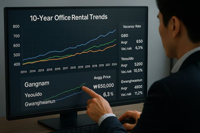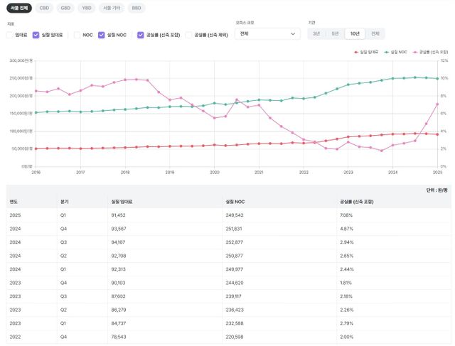 서울 전체 대형 빌딩 임대료, 공실률 10년간 추이