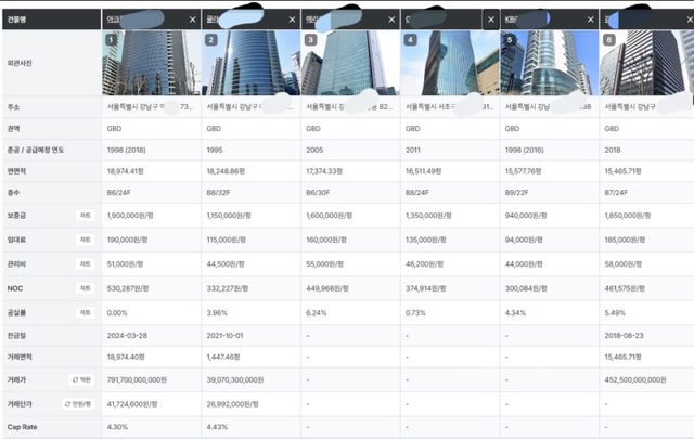 류강민: 맞습니다. 근데 대형 건물을 사고파는 입장에서 또 중요한 게 ‘다른 빌딩과의 비교’예요. 옆에 비슷한 컨디션의 건물이 있는데, 내가 보는 건물보다 임대료가 높아요. 그러면 임대료를 더 높여도 된다는 거고, 그만큼 건물 가치도 상승할 수 있는 거겠죠. 그래서 RA는 비슷한 조건의 건물들과 자동 비교도 제공합니다. 예로 2023년에는 GFC 임대료가 높았지만, 비슷한 조건의 건물 임대료가 따라오르는 걸 알 수 있죠. 필요할 경우. 원하는 빌딩들만 지정해서 비교할 수도 있습니다.