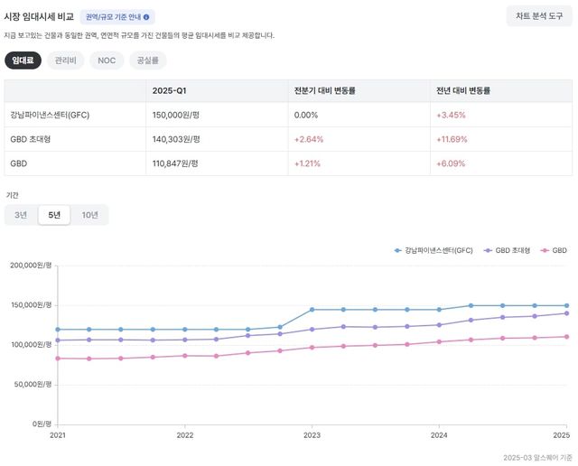 최근 5년간 GFC, 강남 권역 초대형 빌딩, 강남 권역 전체 평당 임대료 비교