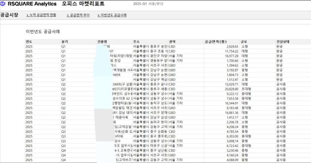 류강민: 캡 레이트는 ‘수익률 변화 추적’이라고 보면 됩니다. 아래 남색은 국고채 5년 추이이고요. 그밖에 공급이 각 권역별로 어떻게 이뤄지고 있는지, 각 빌딩 별로 상세히 볼 수도 있습니다. 이를 통해 그 지역이 잘되고 있는지 알 수 있는 거죠.