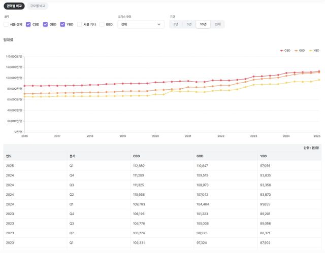 CBD(광화문), GBD(강남), YBD(여의도), 각 권역을 비교해 볼 수 있다