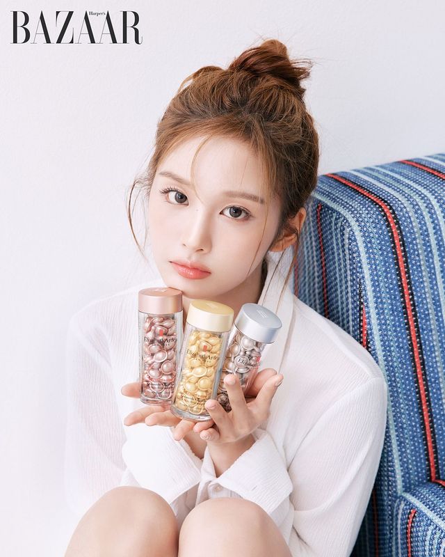 평소 핑크 컬러를 애정하는 설윤이 픽한 핑크 캡슐, 엘리자베스아덴 ‘레티놀 + HPR 세라마이드 캡슐 래피드 스킨 리뉴잉 세럼’. 레티놀이 함유되어 있지만 자극이 적어 낮과 밤에 모두 사용할 수 있는 얼리 안티에이징 제품이다.