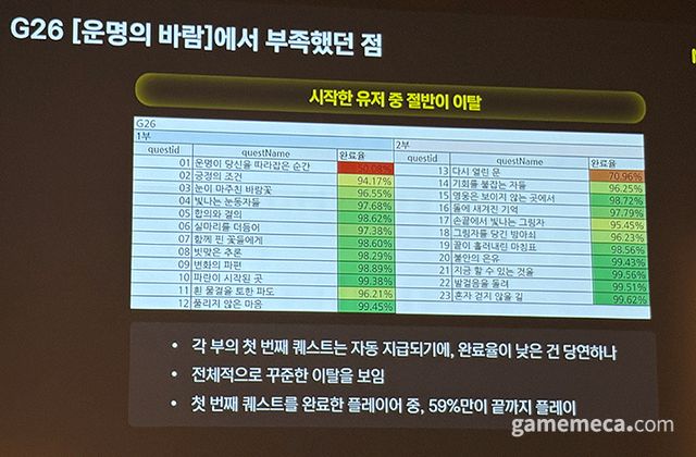 G26의 결과는 만족스럽지 못했다. 전유진 시나리오 라이터는 “첫 퀘스트를 완료한 유저 중 59%만이 끝까지 플레이했고, 흥미를 유지하는 데 실패해 완료율이 뚜렷한 하락세를 보였다. 여러 커뮤니티에서 재미가 없다는 부정적인 동향도 나타났다”라고 말했다. 탄탄하다고 생각했던 구조였으나, 충분히 흥미를 이끌어내지는 못한 것이다.
