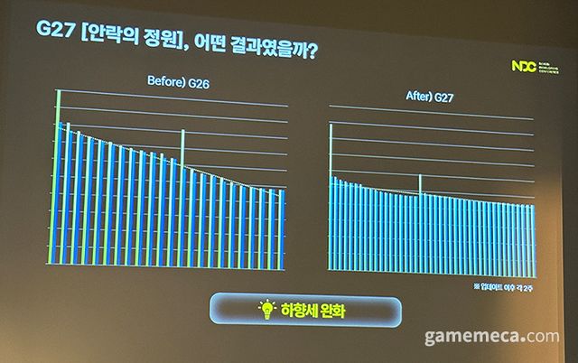 G26 이후 성찰을 거쳐 완성된 G27의 결과는 어땠을까? 전유진 시나리오 라이터는 “전반적으로 높은 완수율을 보였다. 첫 퀘스트를 완료한 플레이어 중 80%가 끝까지 클리어했고. 퀘스트 전반에 허들이 되는 요소가 없어 완료율이 점진적으로 상승하는 흐름을 보였다. 물론 G27에는 이를 클리어해야 던전이 완전히 개방된다는 보상이 있었지만, 그럼에도 여러 커뮤니티에서 긍정적인 동향이 있었다는 점을 말씀드리고 싶다”라고 덧붙였다.
