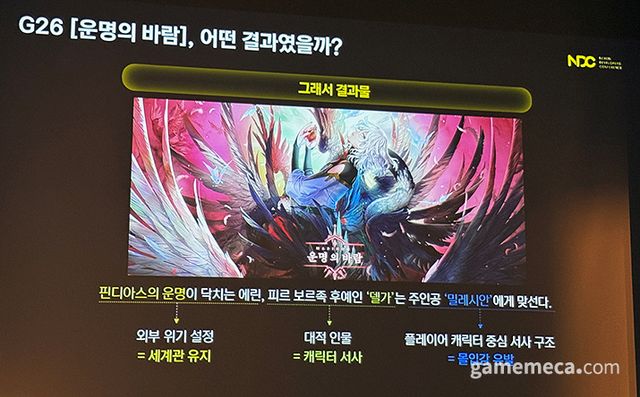 이에 따라 G26 ‘운명의 바람’의 스토리는 핀디아스의 운명이 닥친 에린에서 피르 보르족 후예인 델가가 밀레시안에 맞선다는 방향으로 마련됐다. 전유진 라이터는 “핀디아스의 운명이라는 외부 위기를 설정해 세계관을 유지했고, 델가로 매력적인 서사를 지닌 캐릭터를 보여주려 했다. 마지막으로 밀레시안에게 맞선다로 플레이어 중심으로 몰입을 유도했다”라고 설명했다.