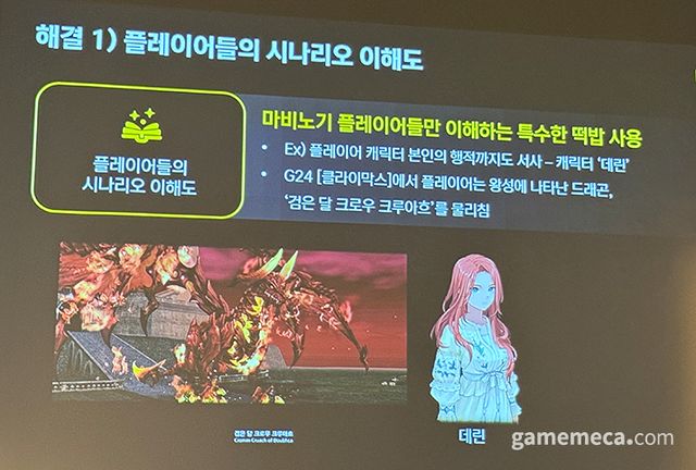 작년에 마비노기에 추가된 메인스트림 G26과 G27을 맡았던 넥슨코리아 전유진 시나리오 라이터는 앞서 이야기한 일을 무수히 많은 바둑알이 놓인 바둑판에 남은 자리를 찾아 계속 해서 ‘신의 한 수’를 두어가는 것에 비유했다.