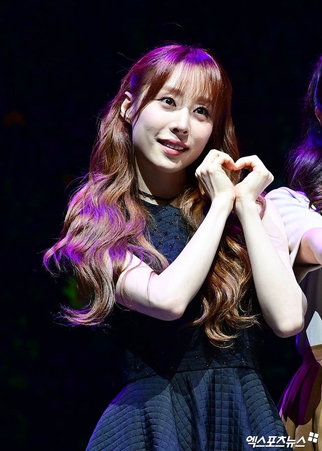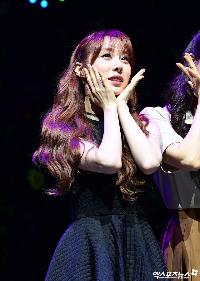 이날 프레스콜에 참석한 우주소녀 유연정이 열연을 펼치고 있다.