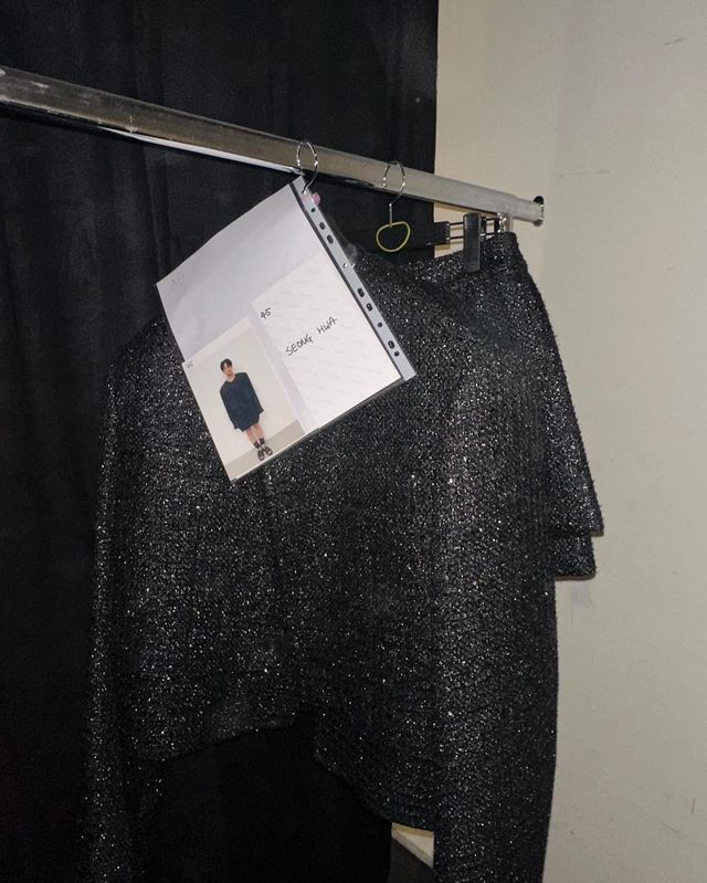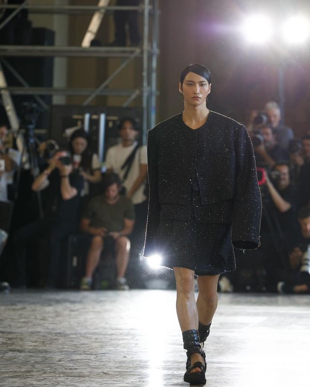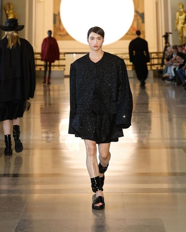 이어 선보인 두 번째 룩은 블랙 트위드 소재의 셋업입니다. 은은한 광택이 도는 텍스처가 무대 조명을 받아 반짝였죠. 품이 큰 재킷과 쇼츠가 조화를 이루며, 절제된 컬러와 실루엣 속에서도 존재감을 뚜렷이 드러냈습니다. 슈즈 역시 첫 번째 룩과 같이 스트랩 샌들로 통일감을 주어 쇼의 완성도를 끌어올렸죠.
