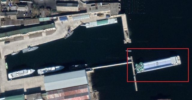강원도 원산 인근 항구에 김 씨 일가 전용 유람선이 정박한 모습. 이 유람선에서 초록색으로 나타나는 부분이 워러 슬라이드로 파악되고 있다. / 구글 어스, 뉴스1