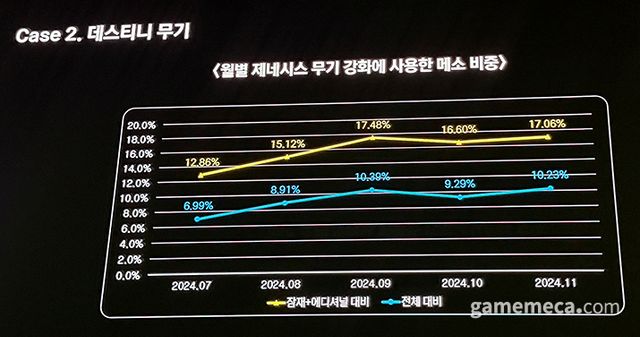 그 결과 23성 이상에 도전한 캐릭터 수는 1.5배 증가했고, 액티브 유저 기준 1명당 사용한 메소는 33% 늘었다. 신규 장비 세트 추가 등으로 대응하지 않고, 기존에 가지고 있던 장비를 상대적으로 상승곡선이 완만해진 비용을 토대로 강화하도록 정비한 이유에 대한 기획 의도를 들어볼 수 있었다. 김재유 기획자는 ”메소 소모처 확장에만 집중하고, 0.1%로 되지 않았던 23성 아이템의 가치를 평가절하했다면 결코 내릴 수 없었던 결정이었을 것“이라고 강조했다.