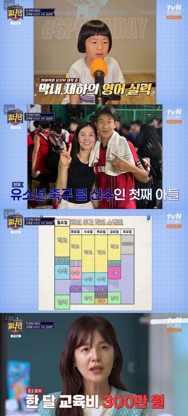 또한 김성은은 딸의 꽉 찬 시간표를 모두 외우고 있다고 전하며 "총 교육비가 300만 원인 이유는 사립초등학교도 보내고 있어서다. 월 100만 원 정도 든다. 사교육비는 200만 원이다"라고 이야기했다.