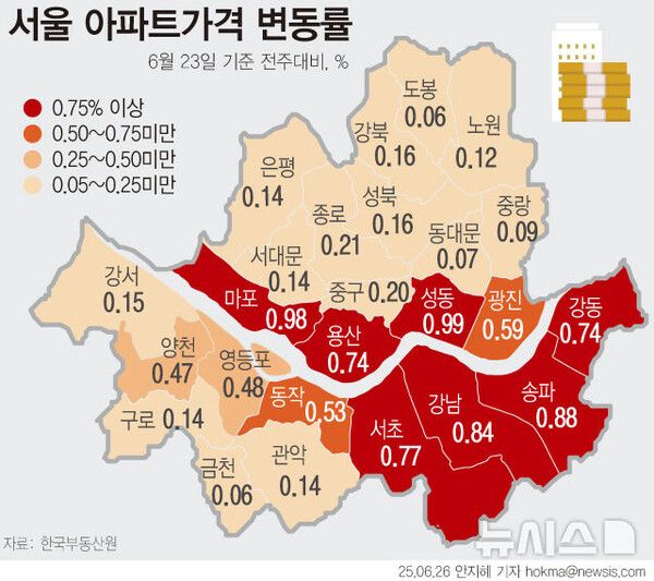 이재명 정부 출범 한 달이 돼가는 동안 서울의 집값은 가파르게 오르고 있다. 한국부동산원이 주간 아파트가격 동향에 따르면 이번주 서울 집값은 1주 전보다 0.43% 오르며 6년 9개월 만에 가장 높은 상승률을 나타냈다. 강남3구(강남·서초·송파)를 필두로 오르기 시작하던 서울 집값은 마포구와 성동구, 강동구, 용산구, 광진구, 동작구 등 '한강벨트'에서도 크게 상승하며 '갭(gap) 메우기' 양상을 보이고 있다.