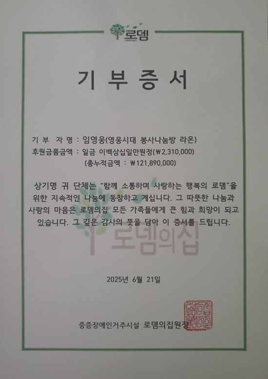 '라온'은 지난 6월 6일 로뎀의집 재건축 비용으로 1,500만 원을 기부한 바 있다. 이들은 "임영웅의 나눔 정신을 따르는 팬으로서 소외된 이웃들에게 따뜻한 온기를 전하고자 앞으로도 지속해서 노력하겠다"라고 말했다.