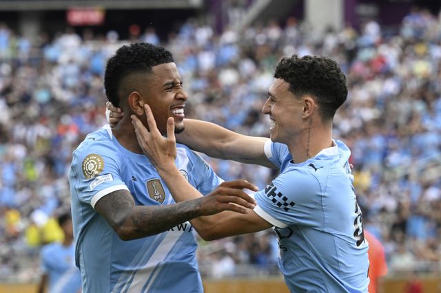 Manchester City's Phil Foden, right, celebrates with teammate Savinho after scoring his side's fourth goal during the Club World Cup Group G soccer match between Juventus and Manchester City in Orlando, Fla., Thursday, June 26, 2025. (AP Photo/Phelan Ebenhack)/2025-06-27 07:03:18/