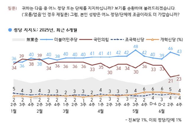 이날 발표된 결과에서 개혁신당과 조국혁신당은 각각 4%, 진보당은 1%를 기록하며 뒤를 이었다. 지지하는 정당이 없다고 밝힌 무당층은 24%였다.