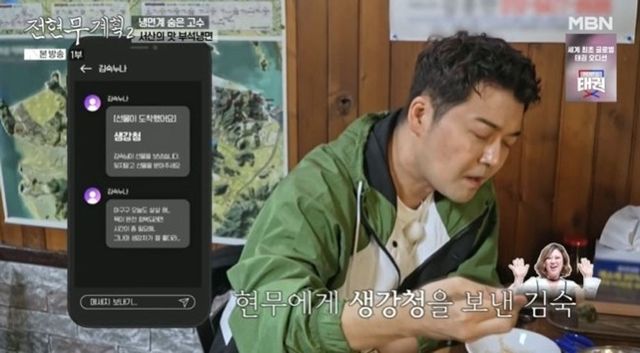 전현무는 맛 표현 중 김숙의 미담도 넌지시 전했다. 전현무는 “얼마 전 후두염을 앓았을 때 김숙 누나가 생강청을 보내줬다”며 “부어서 뜨거운 물 부으면 생강차가 되는데 정확히 (육수가) 그 맛”이라고 덧붙였다.
