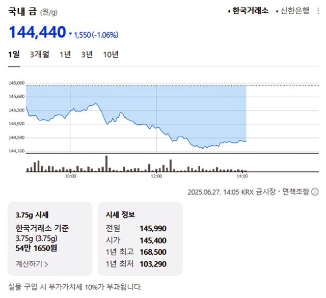 국내 금시세(금값)가 27일(한국 시각) 오후 하락세(전 거래일 대비)를 보이고 있다.