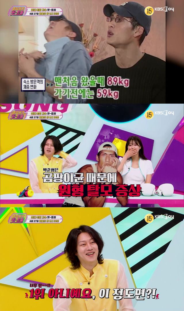 이미주가 "숙소 환경이 너무 열악하다 보니까 박준형 선배님이 곰팡이균이 머리에 옮아서 원형 탈모까지 생겼다"고 전하자 김희철은 "1위 아니냐, 이 정도면?"이라며 안타까워한다.