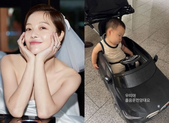 사진 속에는 푸쉬카에 앉아 잠이 든 아들 우인 군의 모습이 담겨 있다. 쏟아지는 졸음을 이기지 못하고 잠이 든 아기의 귀여운 자태가 미소를 자아낸다. 통통한 팔다리와 볼살 또한 사랑스럽다.
