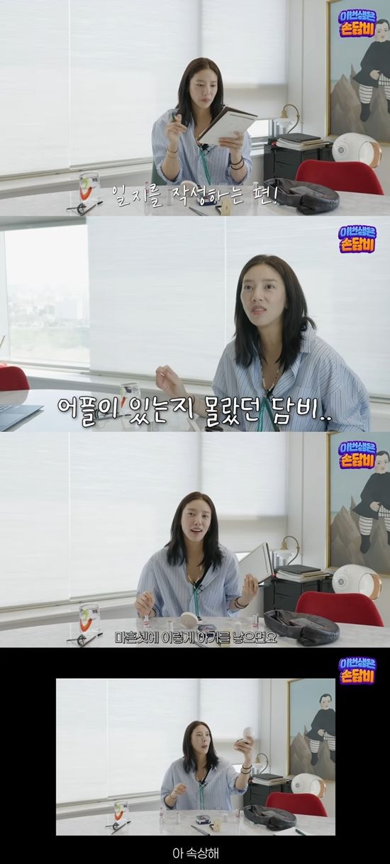 손담비는 "마흔셋에 이렇게 아기를 낳으면 아날로그다. 제가 앱이 있는지 몰랐다. 요즘 부모들은 다 앱을 사용한다. 속상하다"라고 밝혔다.