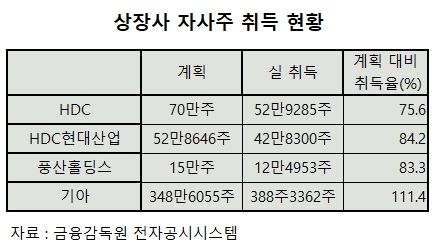올해 3월 주주가치 제고를 위해 사 들이겠다고 약속한 수량(HDC 70만주, HDC현대산업개발 52만8646주)의 75.6%, 84.2% 수준에 그쳤다. 자사주 취득에 들어간 자금은 각각 100억원이다.