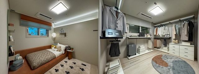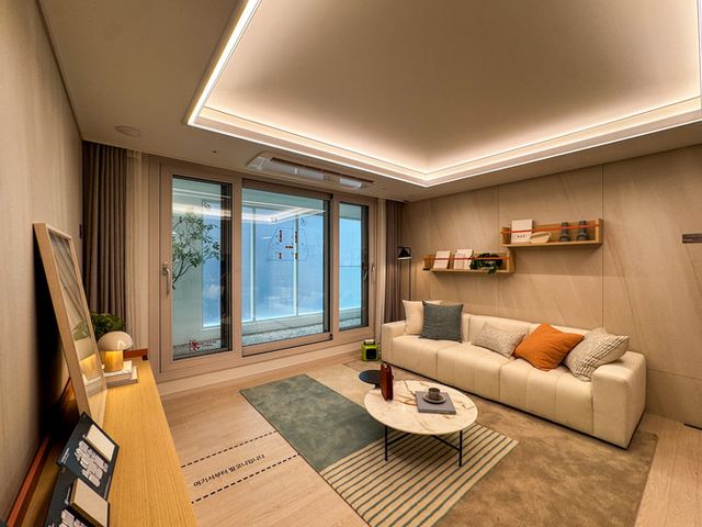 공개된 유니트는 전용 59㎡ 한 타입. 입구에 들어서면 넓은 현관이 눈에 띄고, 거실과 주방은 일체형 구조로 개방감을 강조했다. 안방에는 드레스룸과 파우더룸을 별도 구성해 55㎡ 타입과의 차별성을 부각시켰다. 침실 두 곳은 거실 양쪽으로 분리해 프라이버시 확보에도 신경을 썼다.