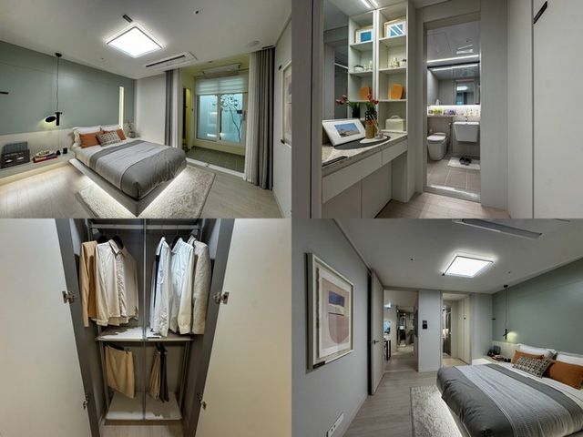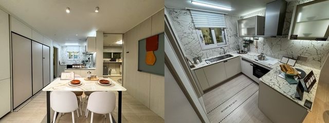 주방에는 플랫장 수납이 적용됐다. 동선이 단순해 식탁 배치도 어렵지 않았다. 슬라이딩 욕실, 밝은 톤의 마감재, 높은 전고(2.3m) 덕분에 실제 평수보다 넓은 느낌을 줬다는 평가도 있었다.