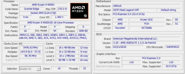 테스트 시스템은 16코어 32스레드 구조의 AMD Ryzen 9 9950X3D 시피유와 ASRock X870 Steel Legend WiFi 메인보드와 Micron Crucial DDR5-6400 CL38 PRO 오버클럭 메모리(블랙)의 조합니다.