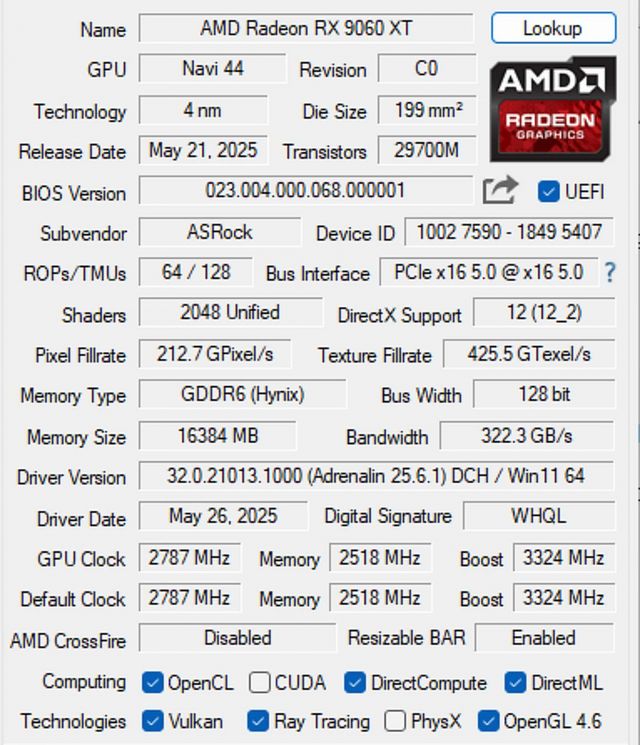 칩셋: AMD Radeon RX 9060 XT (RDNA 3, TSMC 5 nm)