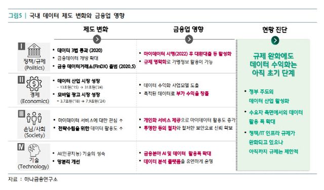 하나금융연구소는 ‘금융회사의 새로운 먹거리로 부상하는 데이터 사업’이란 보고서에서 “국내 데이터 사업이 금융권을 중심으로 직접적 수익화가 본격화되고 있다”며 “데이터 판매 중심의 비즈니스 모델이 산업 성장의 핵심 동력으로 부상하고 있다”고 강조했다. 다만 주요국 대비 국내 데이터 산업은 수익화 초기 단계에 머물고 있다고 지적했다.