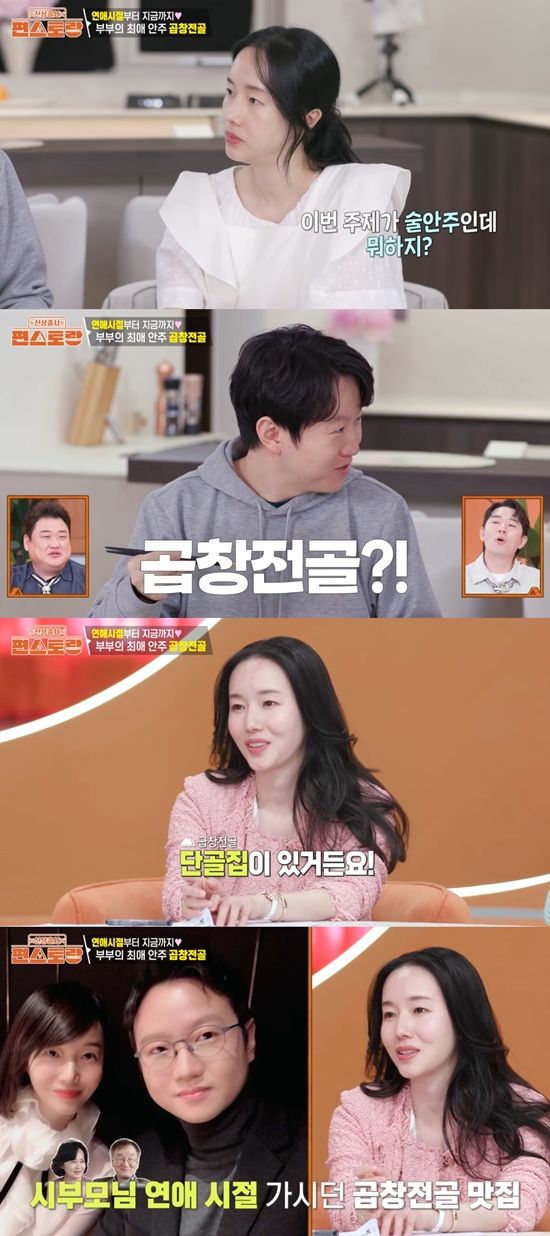 이정현은 무심한 남편을 째려보며 "술안주 될 만한 걸 생각해 봐라. 회식 때 뭐가 제일 인기 많았냐"라고 질문했다. 이정현은 "연애할 때부터 갔던 단골집이 있다. 시아버님, 시어머님 연애할 때부터 갔던 곳인데 저희도 거기에서 사랑이 싹텄다. 너무 좋아하는 메뉴다"라고 덧붙였다.