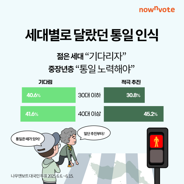 연령별로 보면, 30대 이하에서는 ‘기다려야 한다’는 응답이 40.6%로 ‘빨리 통일해야 한다’(30.8%)보다 9.8%포인트 높았다. 반면 40대 이상에서는 이와 반대로 ‘빨리 통일해야 한다’는 응답이 45.2%로 ‘기다려야 한다’(41.6%)보다 3.6%포인트 높게 나타나, 세대별 통일 추진에 대한 인식 차이가 분명히 드러났다.