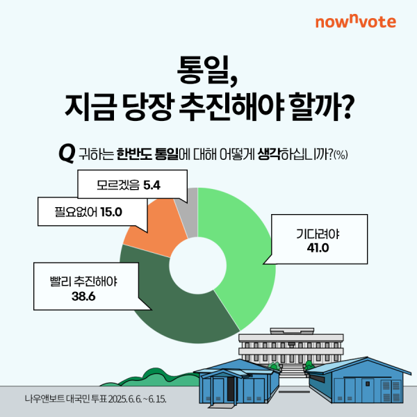 엘림넷 나우앤보트는 2025년 호국보훈의 달을 맞아 6월 6일부터 6월 15일까지 ‘한반도 통일과 평화’를 주제로 대국민 투표를 실시했다. 이번 투표는 전국 만 18세 이상 성인을 대상으로 진행하였으며, 총 1194명의 국민이 나우앤보트 대국민 투표 광장에서 본인 인증 후 1인1표 비밀투표에 참여했다.