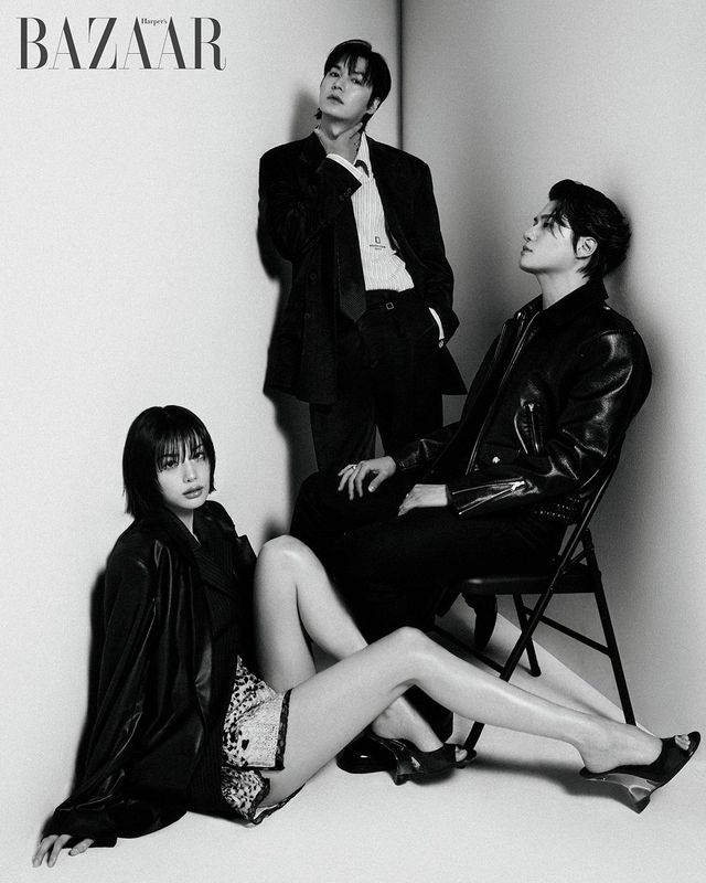 나나가 착용한 재킷, 웨이스트 코트, 쇼츠, 슈즈는 Dries Van Noten. 이민호가 착용한 재킷, 셔츠, 팬츠는 모두 Wooyoungmi. 반지는 Fred. 슈즈는 Balenciaga. 신승호가 착용한 레더 재킷은 Noice. 슬리브리스는 Cos. 반지는 Rocking AG. 팬츠, 슈즈는 스타일리스트 소장품.