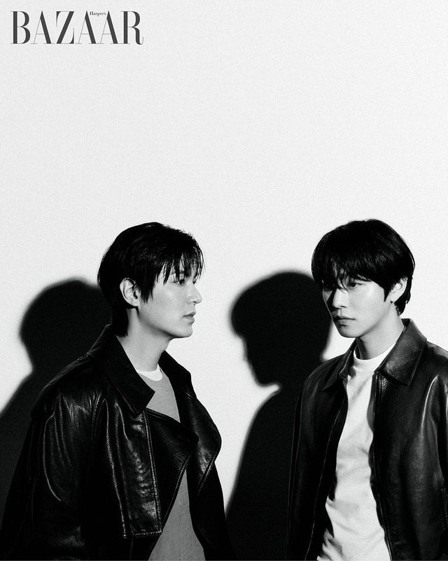 이민호가 레이어드해 착용한 티셔츠는 Jil Sander. 레더 재킷은 Ferragamo. 안효섭이 착용한 레더 점퍼, 톱은 Ferragamo.