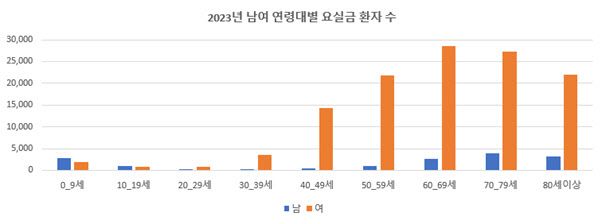 임신과 출산이 주요 원인으로 작용하는 만큼, 요실금은 40대 이후 여성에서 급격히 증가하는 경향을 보인다. 특히 50대 이상 여성의 비율이 매우 높다. 건강보험심사평가원의 국민관심질병통계에 따르면, 2023년 요실금으로 진료받은 환자 135,024명 중 50세 이상 여성 환자는 99,699명으로 73.8%에 달했다.