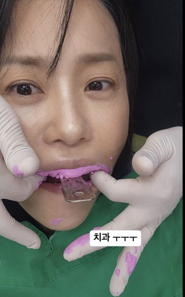 사진 속 고현정은 치과 진료를 받았다. 치아 본을 뜨는 과정에서 분홍색 재료가 입 안 가득 차 있는 모습이 눈길을 끌었다.