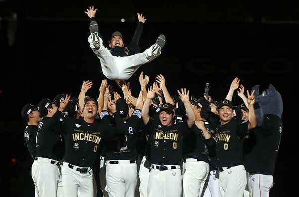 SSG 동료들은 모두 그라운드를 나와 김강민에게 헹가래를 쳤다.