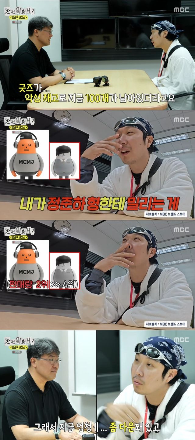 앞서 하하는 MBC 기념품샵에서 유재석의 굿즈는 품절인 반면, 본인은 100개 정 재고가 남았음을 확인했던 바. 하하는 "굿즈가 악성 재고로 100개가 남아있더라. 근데 이제 내가 정준하 형한테 밀리는 게 말이 안 된다고 생각했다. 그래서 지금 엄청 다운돼 있다"고 털어놨다.